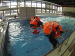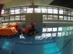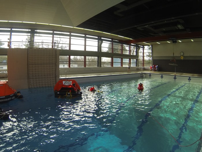 - Verhalten im Wasser: Die ausführlichste Einheit findet im Wellenbad der Kaserne statt. Wir haben uns mit Rettungsinseln und dem Verhalten darin auseinandersetzt, verschiedene Rettungswesten verglichen und getestet. Man glaubt gar nicht wie sch*** schwer es mit voller Wetterschutzkleidung ist, sich zu bewegen oder gar eine Rettungsinsel zu besteigen. Am Ende wurde sogar noch das Verhalten bei Luftrettung per Kran simuliert, glaube das erlebt man auch nicht überall 😉 . Und die gewonnene Erkenntnis, dass eine Rettungsweste unter 275N und ganz speziell ohne Spraycap im Ernstfall mal absolut GAR nichts nützt, hat mich dann doch etwas überrascht. In der Theorie wurde dann noch die Versorgung Unterkühlter behandelt. Dass jeder Teilnehmer des Kurses instinktiv alles falsch gemacht hätte, könnte wohl auch doof enden. Also noch mehr gelernt.