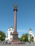 - Sinnbild für die Stadt. Mütterchen Russland Statue neben Konsumtempel.