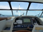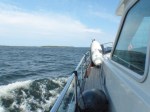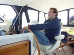 Zunächst geht es also mit dem Zug  wieder zurück von Tammisaari nach Helsinki, wo wir uns am Freitag abends treffen. Schon beim ersten Besuch auf diesem Schiff war ich ja von der schieren Größe überrascht, aber jetzt fühle ich mich fast wie in einem Hotel untergebracht. Das was fehlt ist eine weiße Traumschiff-Uniform für Kurt, den Skipper. 😉 Nach kurzer Verproviantierung geht es dann am Samstag auf Richtung Osten. Der Wind weht stark und immer wieder ziehen Schauer durch. Ich denke kurz an meinen eigentlichen Plan, diese Strecke mit der Nonsuch zurückzulegen, und freue mich, dass ich nun hier auf diese Art reisen kann. Auf der wettergeschützen Brücke ist das Fahren eine ganz entspannte Sache. Komisch, sobald man auf der „anderen Seite“ hinterm Ruder steht hat man auch keine große Lust, den Seglerkameraden auszuweichen. Erinnert mich ein wenig an die Geschichte mit Rad- und Autofahrern… 😉
