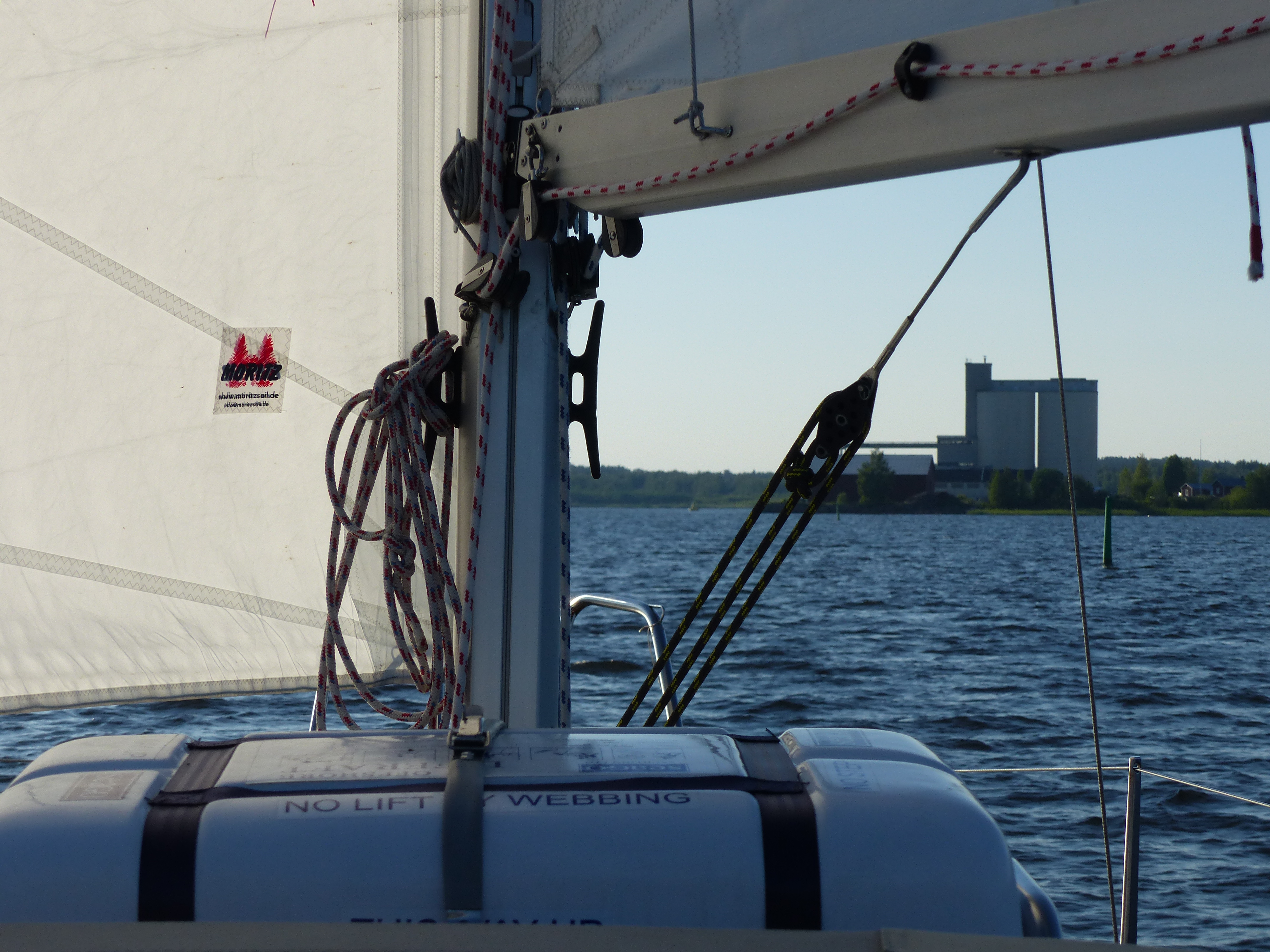 Jetzt weiß ich auch wie Du das Einleinenreff geführt hast…. Je ein Doppelblock knapp unterm Lümmel am Mast…..