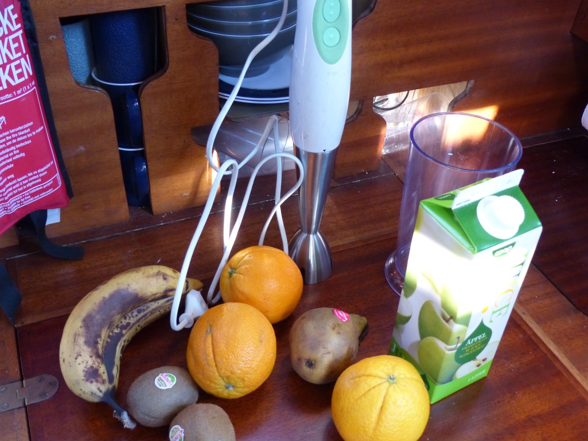 P1010481 Veröffentlicht 24. Juli 2014 in 4000 × 3000 in Kochen an Bord: Fruchtsmoothie für faule Herrentörns. Nächste → Früchte, Fruchtsaft, Joghurt und ein Pürierstab sind die Grundzutaten.