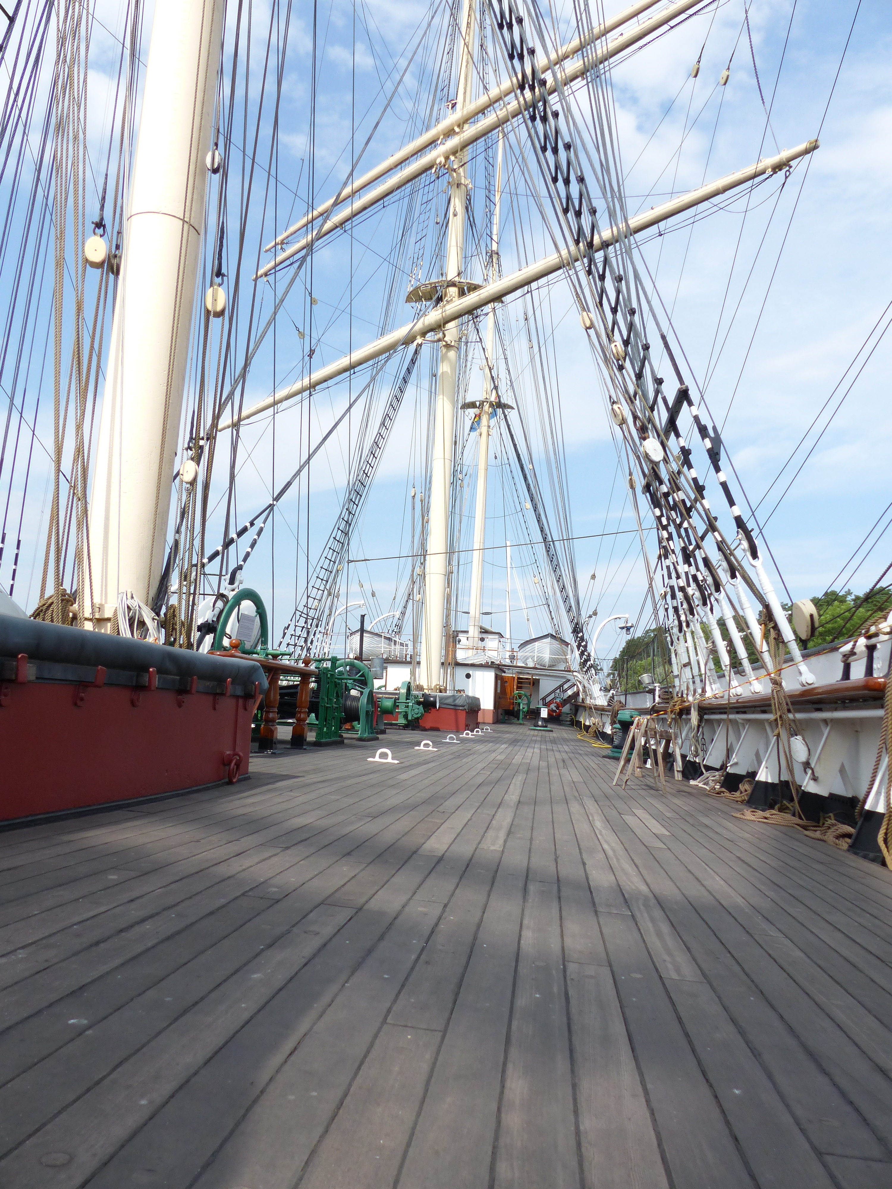 Meine Motivation zum Besuch war anfangs eher mäßig und eher dem „kulturellen Pflichtprogramm“ von Zeit zu Zeit geschuldet. Es hat sich aber von vorne bis hinten gelohnt. Die Pommern gehört zu den Flying-P Linern der Hamburger Laeisz Reederei und ist ein Schwesterschiff der Passat und Kruzenshtern, ex Padua. Nach Mariehamn ist sie durch den åländischen Reerder Eriksson gekommen, der als letzter weltweit noch auf Segelschiffe zum kommerziellen Frachttransport setzte. Als die Pommern nicht mehr rentabel betrieben werden konnte, wurde sie der Stadt Mariehamn als Museumsschiff, mit der Bedingung, sie im Originalzustand zu belassen, übergeben. Und gerade das macht ihren Reiz aus. Ich kenne viele Museumsschiffe. Die Passat, HMS Victory und allein auf dieser Reise die Aurora und mittlerweile die Wasa. Abgesehen von der englischen Victory war aber keines so lebendig wie die Pommern. Ich bin auch schon auf mehreren Großseglern eine Zeit lang gefahren, kenne also den Betrieb dieser Schiffe. Umso mehr fasziniert mich, wie dieses Schiff gesegelt wurde. Wie die Mannschaft (gerade mal 24 Mann, das ist nix auf so einem Dampfer) gelebt und gearbeitet hat. Die Pommern ist mit allen Räumen bis hin zum Kielschwein frei zugägänglich. Das kommt der Lebendigkeit und dem Verständnis sehr zugute. Nur in die Toppen wollte man mich irgendwie nicht lassen… 😉