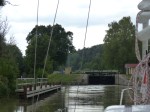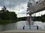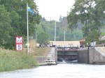 Meine Entscheidung hatte ich ja nun zugunsten des Göta Kanals getroffen. Ich verliess die Eisbeere also frühmorgens und machte mich zu einem herrlichen letzten Segeltag an der Ostküste auf. Die Sonne brannte, der Wind kam mal aus der besten Richtung, und so ging es Richtung Mem, der Einfahrt zum Kanal. Der Weg führt relativ weit in einen Fjord hinein. Und einsam war es. Je weiter man sich von Stockholm entfernt, desto mehr nehmen die Boote ab. Hier war ich zum Schluss mal wieder ganz allein. Es ist Anfang August, und so hoffe ich, dass der Kanal nicht zu überfüllt ist. Die schwedischen Sommerferien gehen ja in wenigen Tagen zuende… Mittlerweile freue ich mich auch ein wenig auf den Kanal. Die Erfahrung in diesen leeren Fjord hineinzufahren, der mich mal sehr an die Fahrt nach Töre, dann wieder an die Schlei , erinnert, tut ihr übrigens. Aber das Wetter zieht sich zu. Dunkle Wolken trüben die Stimmung etwas, doch dann taucht die erste Kanalschleuse am Ende des Fjordes auf, und meine Laune wird schlagartig wieder besser. Schon komisch. Stellt euch vor, am Ende der Schlei bei Schleswig gäbe es eine Schleuse und es geht plötzlich weiter.
