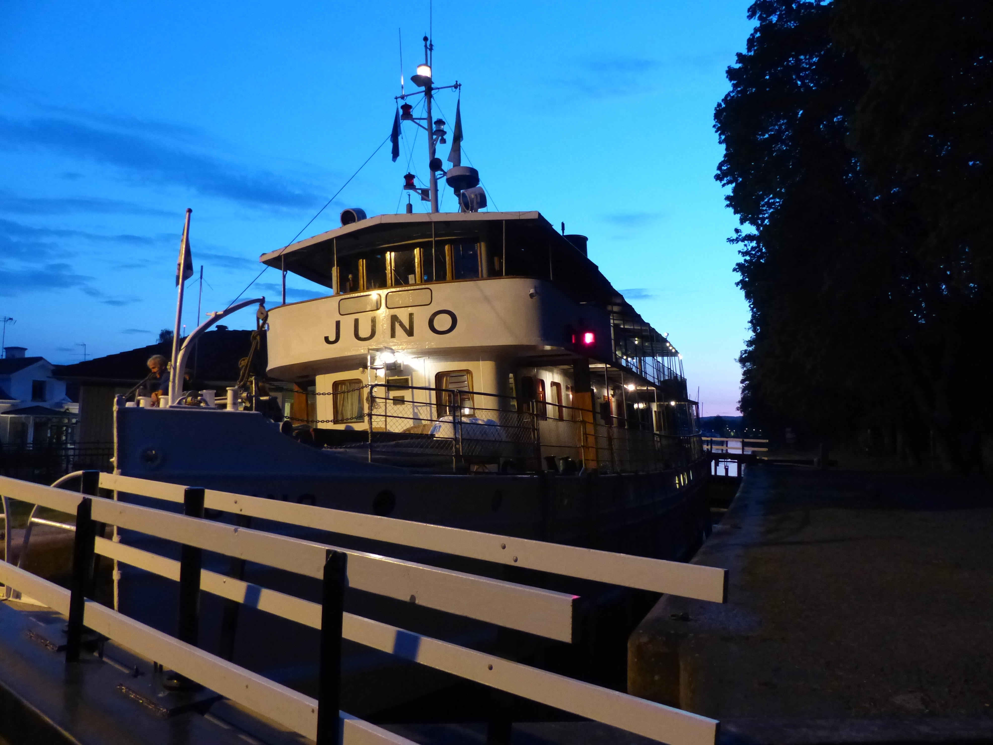 Nach 2 weiteren Schleusen komme ich in Söderköping an. Hier liegt man direkt längsseits an der Promenade und es ist sogar noch ein wenig Leben. Ich bin richtig froh hier zu sein. Ich erkunde den kleinen Ort, mache das Boot kanalfein, erklimme den höchsten Felsen auf der anderen Uferseite, und gönne mir ein Abendessen im Restaurant. Dazu lerne ich dann noch Paul aus England mit seiner Sirius kennen. Wir kommen sofort ins Gespräch, tauschen viele praktische Siriustipps aus, und da Paul den Kanal von der anderen Seite befahren hat, hole ich mir auch gleich noch ein paar wertvolle Tips ab. Als dann Abends noch die Juno, das älteste Passagierschiff der Welt, Söderköping passiert, ist die Kanalromantik perfekt. Eigentlich habe ich den Kanal bisher nur als Verkehrsweg gesehen, doch es braucht keine 6 Stunden, um mich davon zu überzeugen, dass er viel mehr als das ist.
