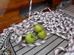 Danach geht es durch unzählige Schleusen den Kanal entlang. Selbst alleine ist das Schleusen total easy. Man reicht den Schleusenwärtern die Leinen hoch. Die Vorleine wird senkrecht am Heck festgesetzt, die Vorleine geht weit nach vorne und wird dann per Winsch während der Schleusung dichtgeholt. Mit jeder Schleuse kommt mehr Routine in die Sache rein, aber langweilig wird es irgendwie trotzdem nie. Und dann kommt eines dieser Erlebnisse, die den Göta Kanal so besonders machen: Neben einer Schleuse steht ein Apfelbaum. Als der Schleusenwärter mich auf sein Niveau hochregelt hat und ich von Bord gehen kann, frage ich ihn, wem der den wohl gehört. Keine Ahnung. Klasse, ich nehme mir also ein paar selsbtgepflückte Kanaläpfel mit. Die schmecken geich 3mal so gut. Der selbe Typ ist dann auch noch für die nächste Schleuse zuständig. Da hinter mir ein kleines Motorboot erwartet wird, muss ich dort auf ihn warten. Als er dann ankommt, hat er eine Tüte dabei: Er hat mir noch ein paar mehr Äpfel mitgebracht. Total genial. Dieser Bewässerungsgraben wird mir immer sympathischer.