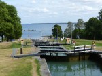 Schon von weitem ist dann nach ein paar Stunden die Schleusentreppe von Berg zu erkennen. 7 Schleusen direkt hintereinander bringen einen knapp 20m höher. Uff, das schaut nach Arbeit aus. Mein Tatendrang wird dann aber von der Schleusenmaus gebremst. Erstmal 3 Stunden warten, ein Passagierschiff will runter. Kurz überlege ich, ob mich ärgern soll, aber wieder macht der Kanal seine Arbeit: „Mir egal, ich will heute nur noch in den oberen Hafen. Ob ich jetzt oben oder unten den Nachmittag rumlunger ist mir doch Wurst.“ Ein Eis am Kiosk – Eis ist glaube ich in Italien für den schwedischen Markt erfunden worden, so wie die Schweden darauf abfahren – ein Rundgang um das Schleusengelände, und mal schauen wie die Profis vom Rentnerfrachter das Schleusen so bewältigen. Ausserdem scheinen die Schleusen den Mittelpunkt eines Parks zu bilden. Überall ist den ganzen Nachmittag Leben. Als ich die 20 Höhenmeter (ohne Boot) wieder herabgestiegen bin, hat hinter mir ein kleines deutsches Motorboot festgemacht. Trotz der Tatsache, dass es sich um Bremer handelt, sind sie eigentlich ganz nett 😉 . 7 Mann und 1 Hund auf 6m Motorboot. Respekt. Erste kühle Getränke und Hamburg-Bremen Nickeligkeiten werden ausgetauscht.