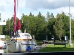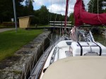 In der nächsten Schleusentreppe warten bereits zwei andere Boote. Aber keine Wärterin in Sicht. Da eh nix mehr los ist bedient sie gleich mehrere Schleusen und ist gerade ein paar Kilometer weiter mit einem Passagierschiff beschäftigt. Ich könnte natürlich selbst, Johan hat mir ja gezeigt wie….. Aber ne, das gibt bestimmt Stress… 😉 Stattdessen freunde ich mich mit einem dänischen Paar aus Svendborg an. Das liegt ja direkt um die Ecke von der Schlei… Wir bringen die letzten Schleusen gemeinsam hinter uns und verbringen den gemeinsam Abend in Sjötorp. Der Ort macht einen völlig verlassenen Eindruck. Es ist wohl nicht zu leugnen, dass der Sommer zuende ist. Wir liegen im Werftbecken. Von hier sind es noch Luftlinie 500m bis zum Ende des Kanals. Und so ist nicht nur der Sommer, sondern bald auch der wunderschöne Göta Kanal zu Ende…