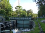 Vorsichtig taste ich mich in das Fahrwasser am Westufer hinein. Ein Schild verkündet, dass hier der Dalsland-Kanal beginnt. Da der gesuchte Hafen vor der Eingangsschleuse liegt, bin ich also schon mal richtig. Die letzte Meile wird vielleicht zur schönsten der gesamten Reise bisher. Die Abstände zum Ufer kann man nicht mehr in Metern, sondern nur noch in Dezimetern messen. Gleichzeitig wirkt alles wildromantisch verlottert. Ganz anders als der rausgeputzte Göta Kanal. Das letzte Hindernis auf dem Weg ist eine Eisenbahnbrücke. Die hatte uns eigentlich davon abgehalten hier hin zu fahren, aber der Fischer in Läcko hatte Recht, und sie kann sich auf Anfrage öffnen. Das geht mittels einer Gegensprechanlage. Die Dame am anderen Ende klingt zwar ganz sympathisch, plärrt aber so dermaßen laut aus dem schlecht eingestellten Lautsprecher, dass ich vor Schreck fast rückwärts über Bord falle. Dafür macht sie aber sofort auf. Keine 500m weiter, schaut es dann zunächst so aus, als ob es nicht weiter geht, aber dann sehe ich dort die Ka´Li und das heutige Ziel. Köpmannebro. Hier beginnt der Dalsland-Kanal. Der ist eigentlich kein richtiger Kanal, sondern nur einzelne Stücke die eine Seenplatte miteinander verbinden, und soll sehr schön sein. Auch mir gefällt es mir vom ersten Moment an so gut, dass ich kurz überlege einen Abstecher hier rein zu machen. Hier endet die Saison allerdings genau morgen früh. Den Plan muss ich also verschieben. So habe ich aber wenigstens einen Vorwand, noch mal hier her ins Binnenland zu kommen, denn mir gefällt es wirklich sehr. Der Hafen, eigentlich nur ein Holzsteg zum Warten vor der Dalslandschleuse, liegt ein einem tiefen Felseinschnitt, an 3 Seiten von hohen Bäumen umgeben. Dadurch bekommt man von den Häusern drumherum eigentlich überhaupt nichts mit. Die Schleuse selbst macht einen ebenso verwirrterten Eindruck. Ein ganz eigenartiger und wildromantischer Platz. Es ist still, es ist einsam. Natur und Industriegeschichte direkt nebeneinander. Besser geht es nicht. Dazu eiskaltes Bier und selbstgegrillte Hamburger. Jetzt geht es aber wirklich nicht mehr besser. Und schon wieder glaube ich, dass das nun aber der schönste Platz der Reise ist. Der Vänern gefällt mir mit jeder Minute besser.