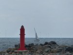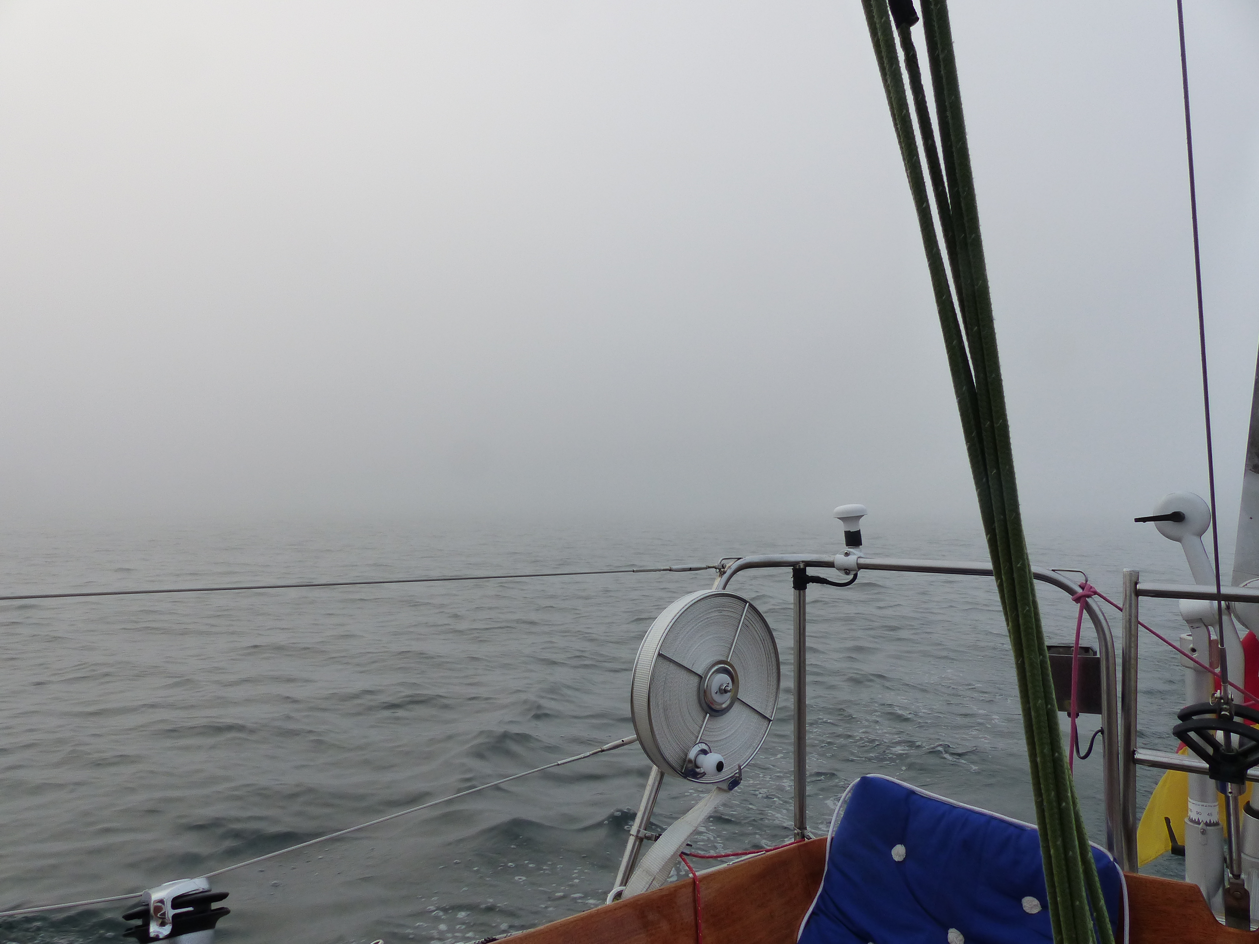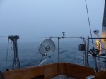 Ich bin gerade irgendwo im Nirgendwo zwischen der Insel Laesø und Anholt und nach dem letzten Rundumblick vor 5 Minuten eher in mein Buch vertieft, als mir auf einmal buchstäblich ein kalter feuchter Schauer durchs Gesicht fährt. Ich blicke auf und sehe: Nichts. Mal wieder Nebel. Keine 50m Sicht und der Wind schläft innerhalb von Sekunden ein. Nach einigen Minuten wüster Flüche (Nebel hatte ich dieses Jahr nun schon wirklich genug) arrangier ich mich halt damit. Hier ist sowieso nichts los, das letzte Schiff habe ich schon vor Stunden gesehen. Außerdem bin ich mitten auf offener See weitab der Schifffahrtsrouten, außer Häfen der sicherste Platz im Nebel. Nach den Nebelerfahrungen im Frühjahr gehe ich mittlerweile ziemlich locker damit um. „Einfach weiter, passt schon“. Was soll man auch schon anderes machen. Wenn ich einfach liegenbleibe und nichts tue bleiben mir im Zweifel wenn jemand auftaucht nur Sekundenbruchteile mehr, um zu reagieren, als wenn ich einfach weitertucker. Das bringts dann auch nicht…