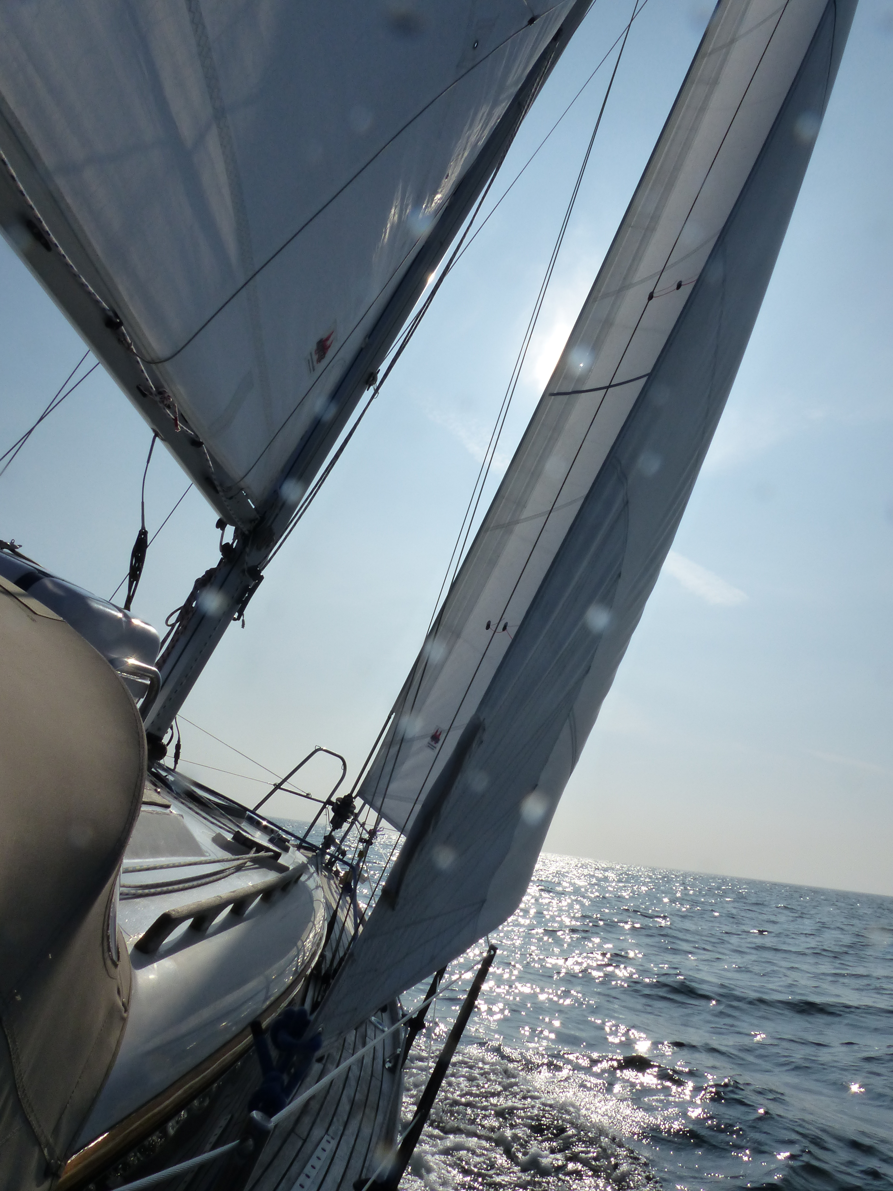Die letzten 4 Meilen dieser langen Reise stehen an. Noch 8000m bis Kappeln. Und alles spielt zusammen. Sogar der Wind, der immer noch aus Osten kommt, denn dass man die Schlei wirklich reinsegeln kann kommt nicht alle Tage vor. Die Sonne scheint, einen guten Freund dabei  und 6 Monate auf See im Gepäck. Die Stereoanlage brüllt so laut sie kann, und wir singen mit. „Tage wie Diese“ von den Toten Hosen, mein Lieblingssong „Midnight City“, so Klassiker wie „Danger Zone“. Zu unserem Erstaunen ist nichtmal irgendein Entgegenkommer oder Überholer genervt. Jeder hat Verständnid für diese unbändige Freude, für dieses Auskosten des Augenblicks.