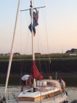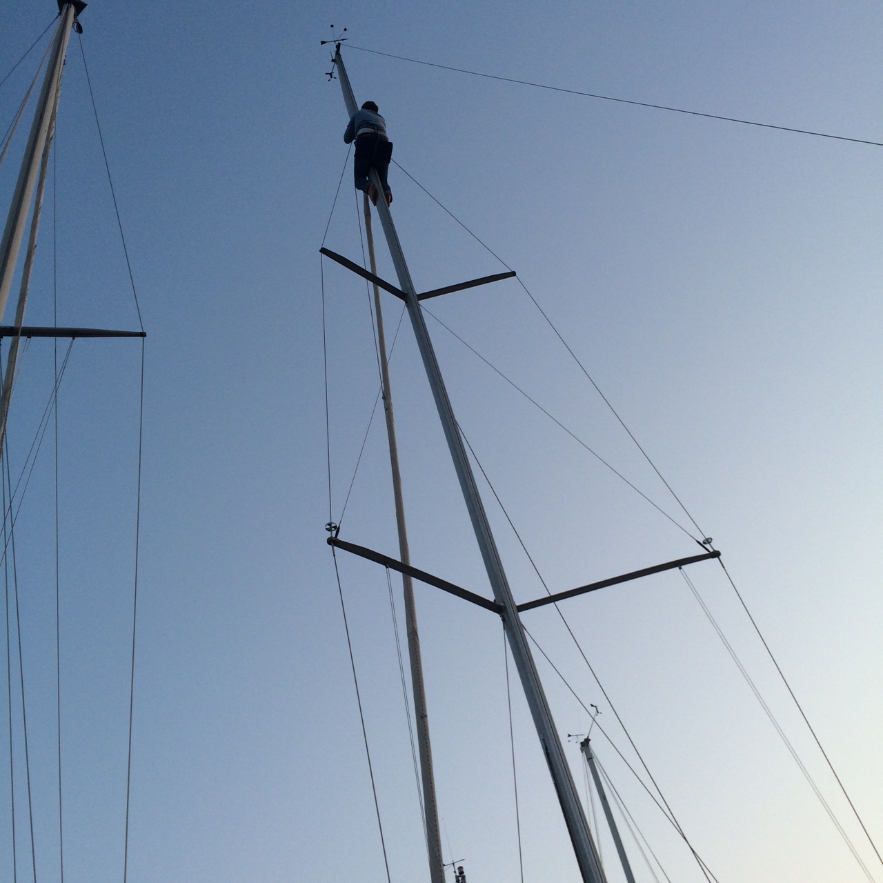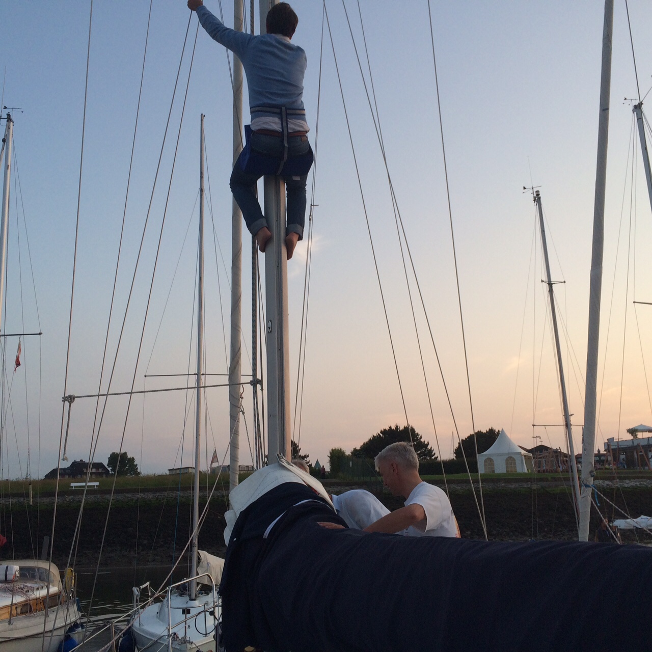 Unten angekommen schaut Sven dann nur so verdächtig in seinen eigenen Masttopp. Was tut man nicht alles für Kameraden: Ich frage nur noch scherzhaft, was bei ihm denn so zu machen wäre. Also gleich das Ganze noch mal von vorn. Obwohl es schon 22:00 ist. Hat aber auch Vorteile, denn auf Svens 20m Kloppermast erlebe ich so noch einen zweiten Sonnenuntergang. Mittlerweile hab ich als Kletterhörnchen auch die Aufmerksamkeit des halben Hafens plus Touristen an der Promenade. Und ich bin wieder komplett im Training.