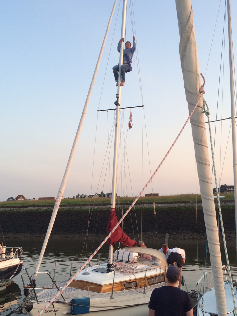 Aber unten angekommen kratzt sich Stephan nun so verdächtig am Kopf. „Also da ist noch so eine Flaggleine bei mir unter der Saling…“. Also das Ganze noch mal von Vorne. Nur, dass der zweite Mast schon gute 15m hat. Wenigstens hat sich mit Sven noch der nächste Stegnachbar zur Hilfe angeboten. Wenigstens quengeln die Kurbelmatrosen da unten also nicht mehr so laut. Kann man oben eh nicht hören. 😉