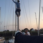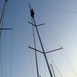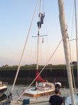 Also sich fix bei Stephan gegenüber einen Bootsmannsstuhl ausgeliehen. „Komm, zu dritt gehts einfacher!“ meinte er noch, und schon gehts für mich in die zweite Etage. So hab ich mir den Freitag Abend irgendwie nicht vorgestellt. Meine Höhenangst hält sich zwar in Grenzen, aber irgendwie ist diese Mastkletterei doch nicht die Lieblingsbeschäftigung eines Skippers. Die „Boah bist du schwer geworden“ Rufe der Kollegen unten an der Kurbel machen das Ganze auch nicht angenehmer. Oben angekommen das Fall wieder runtergeholt und zurück in die 1. Etage – Herrenmode. Dachte ich mir so.