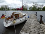 Mit jedem Meter wird die Landschaft nordseeähnlicher. Schon seit geraumer Zeit säumen kleine Sommerdeiche das Ufer. Bis zur Errichtung der Schleuse Nordfeld 1936 war dieses Gebiet, welches heute die tidefreie Binneneider bildet, nämlich von den Gezeiten durchspült. Nun wird das Fahrwasser auch noch mit den nordseetypischen Pricken markiert. Bald darauf mache ich an einem kleinen Steg fest an dem schon einige Boote liegen. Hafenmeister gibt es hier keinen. Der Hafen gehört einem kleinen Wassersportverein. Ein zufällig vorbeischauendes Mitglied kassiert von mir ganze 8€ und schließt die Duschen für mich auf. Hier gehen die Uhren noch anders als an den großen touristischen Zentren der Ostseeküste. Auch wieder ein Eindruck der sich in den nächsten Wochen noch positiv verstärken sollte.