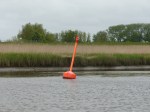 Sofort nach der Schleuse geht es nicht mehr durch die flußähnliche Binneneider, sondern durch ein waschechtes Nordsee-Tidenrevier: Die Tideneider. Nicht mehr Weiden und hohe Bäume säumen das Ufer, sondern hohe Schlickbänke, breite Schilfgürtel, Pricken, Seehunde, und Wattvogelkolonien. Umso spannender waren die ersten Meter. Obwohl die Navigation natürlich etwas komplizierter wird als in der Binneneider gibt es einfach so viel zu schauen und entdecken. Und dazu das vielleicht schönste an der Nordsee im Vergleich zur Ostsee: Die salzige Luft die schon gestern am Liegeplatz in Nordfeld die Vorfreude auf die kommenden Tage gesteigert hat. Da heute ein Feiertag (Himmelfahrt) ist mussten wir den Wärter der nächsten Brücke leider schon um 08:00 von süßen Träumen in die Rufbereitschaft „erlösen“. Während er einige Zeit später auf der Brücke zu seinem Häuschen schlurfte richtete er doch tatsächlich noch Gürtel und stopfte das Hemd in die Hose. Ups…