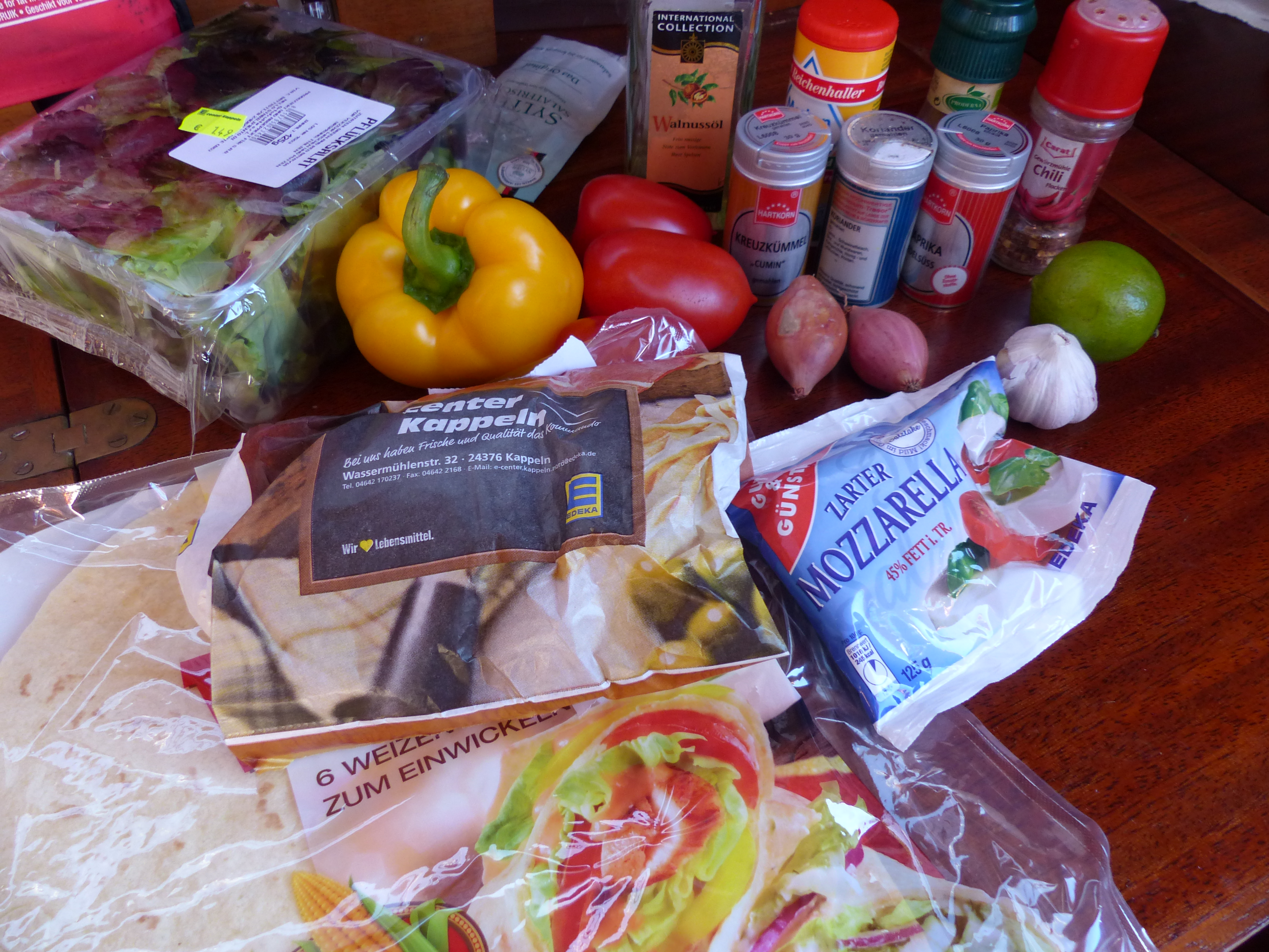Die Rede ist von Weizentortillas mit einer mexikanisch angehauchten Hack-Mais-Käsefüllung. Und wenn man darauf keine Lust hat, oder der dänische Supermarkt gerade leider keine gefräste Kuh im Angebot hat, könnte man sich ja zum Beispiel auch ne Chicken Ceasar Füllung basteln. Oder doch vegetarisch? Der Fantasie sind jedenfalls keine Grenzen gesetzt. Die Tortillas mache ich an Bord allerdings nicht selber. Das wäre dann doch etwas zu aufwendig. Fertige Tortillas halten sich ohne Kühlung viele Monate und eignen sich an Bord hervorragend zur Resteverwertung mit Stil. Also, los gehts: