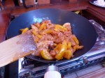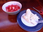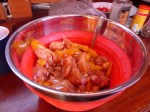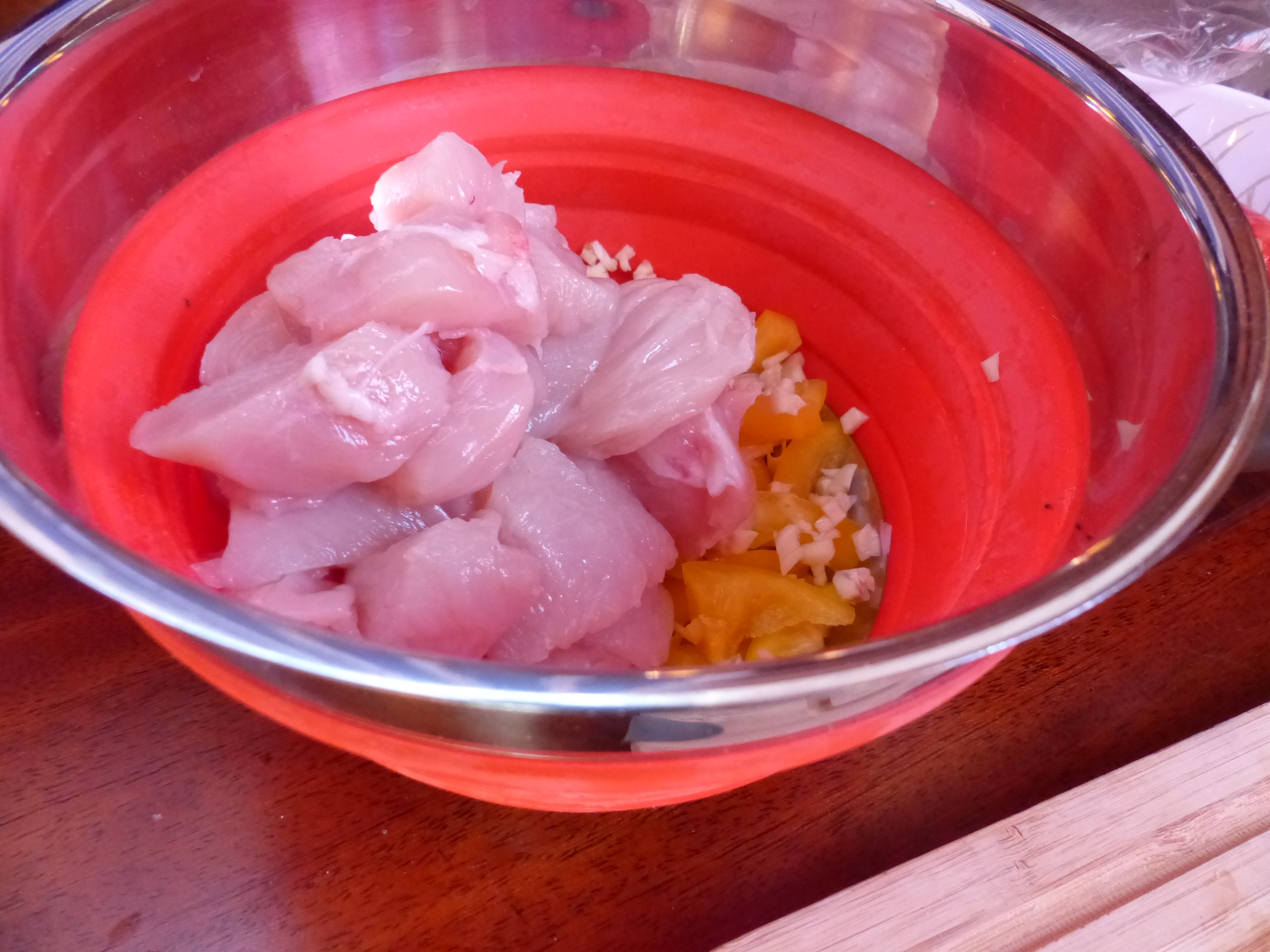 - Hühnerbrust ebenfalls in kleiner Nuggets zerteilen und mit Zwiebeln und Paprika mixen.