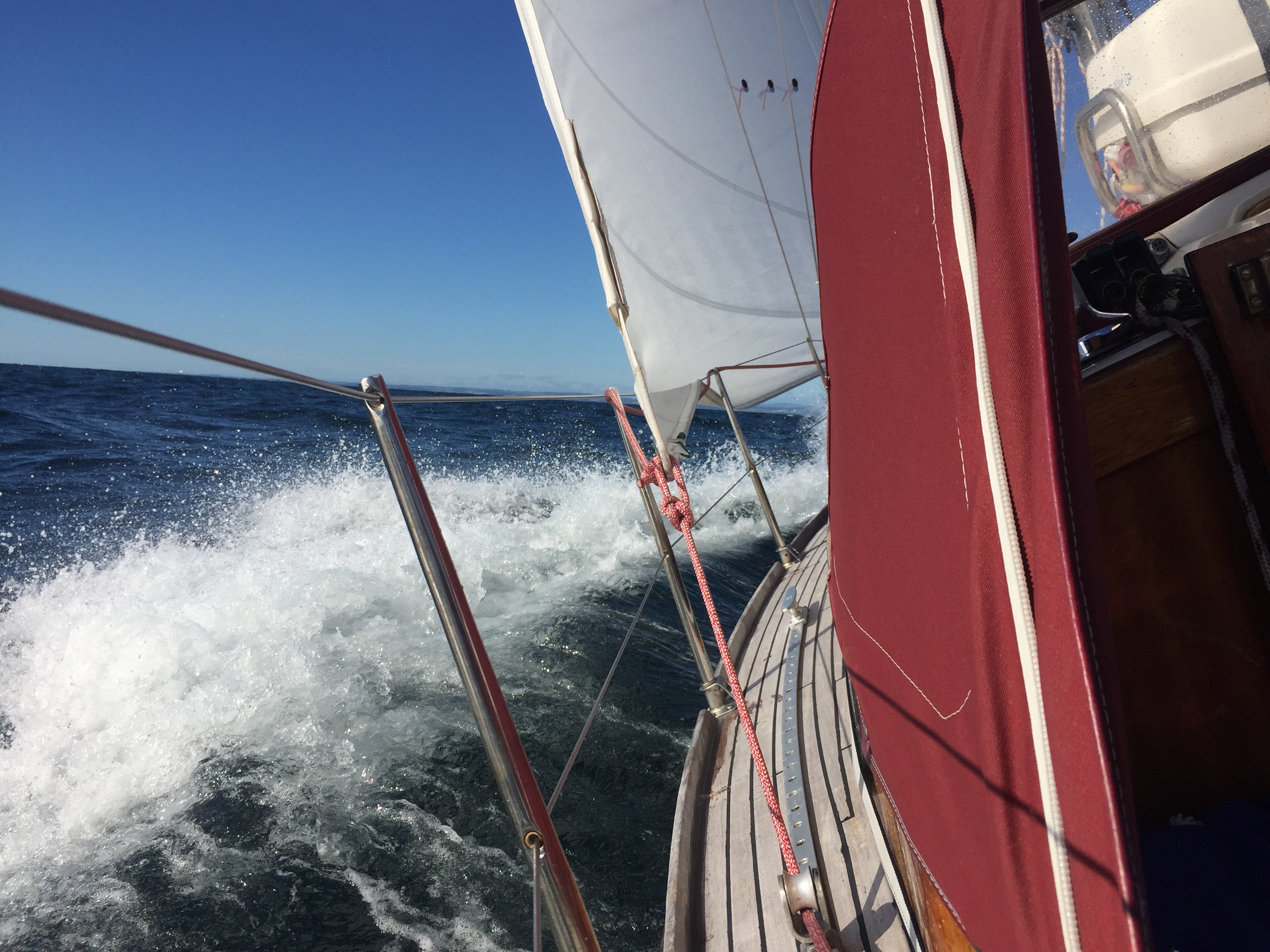 Eine kurze Überlege- und Abwägungsphase folgt. Der Wind bläst jetzt schon mit etwa 20kn von vorne. Natürlich könnte man das aufkreuzen. Der Hafen von Arbroath ist jedoch ab halber Tide mit einem Schleusentor verschlossen, wir müssten spätestens um 1600 dort sein. Ob das bei den aktuellen Bedingungen gelingt ist sehr fraglich. Könnte klappen, wir hätten aber überhaupt keine Reserven mehr. Also ist Arbroath nicht mehr sicher zu machen. Ein weiteres Mal macht sich der Bananenkurs bezahlt und wir können uns einen Hafen südlicher aussuchen. Die Wahl fällt auf Eyemouth. Immerhin schon in Schottland. Eigentlich mag ich dieses Gefühl, gemachte Pläne aufgeben zu müssen ja nicht sonderlich, aber heute ist das irgendwie egal. Ein Törn über die Nordsee lässt einen die richtigen Prioritäten setzen.