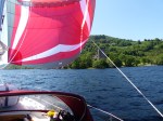 Nach dem Anker aufholen kommt mir aber die positive Seite des Winddrehers in den Kopf: Für den Rest des Weges kommt der Wind nun genau von hinten! Welche Wohltat nach den Motorstunden der vergangenen Tage! Parasail-Time! Schnell ist alles an Bord vorbereitet und Nonsuchs neues rotes Kleid kommt wieder zum Einsatz. Viel besser könnte es doch kaum laufen. 10kn Wind platt vorm Laken, Das Boot läuft mit dem stabil stehenden Parasail, dem durch seinen Flügel auch kleine Böen oder Windlöcher nichts ausmachen, gut an die 6 Knoten. Hätte ich ja mit meinem alten Gennaker mit meinem dicken alten Mädchen vorm Wind nicht für möglich gehalten. Obwohl noch 20SM Loch Ness vor mir liegen vergeht der Rest des Tages wie im Flug. Der über 200m Tiefe See mit seinem torfgeschwärzten Wasser rast nur so unter mir vorbei. Viel schneller als erwartet kommt das kleine Schleusendörfchen Fort Augustus an seinem südwestlichen Ende in Sicht. Schluss vor heute. Nessie ist mit übrigens nicht über den Weg geschwommen. Schon in Eyemouth hatte mir der Hafenmeister aber die wahrscheinlichste Theorie für die Sichtungen verraten. Und die teile ich jetzt mit euch. Achtung, wer in seinem Glauben an Seemonster gelassen werden möchte, schnell unter dem nächsten Bild weiterlesen 😉 Nessie sind in Wirklichkeit Kegelrobben. Die scheint es nämlich auch in Loch Ness zu geben, und sie haben die Angewohnheit manchmal in einer Reihe hintereinander herzuschwimmen. Nur das Leittier guckt aus dem Wasser um die Lage zu checken. Die anderen zeigen nur ihre Rücken. So entsteht der Eindruck ein riesiges Seemonster mit vielen Windungen schwimmt dort durchs Wasser. Macht Sinn für mich, und Kegelrobben habe ich tatsächlich gesehen… Vielleicht also auch DIE eine??! 😉