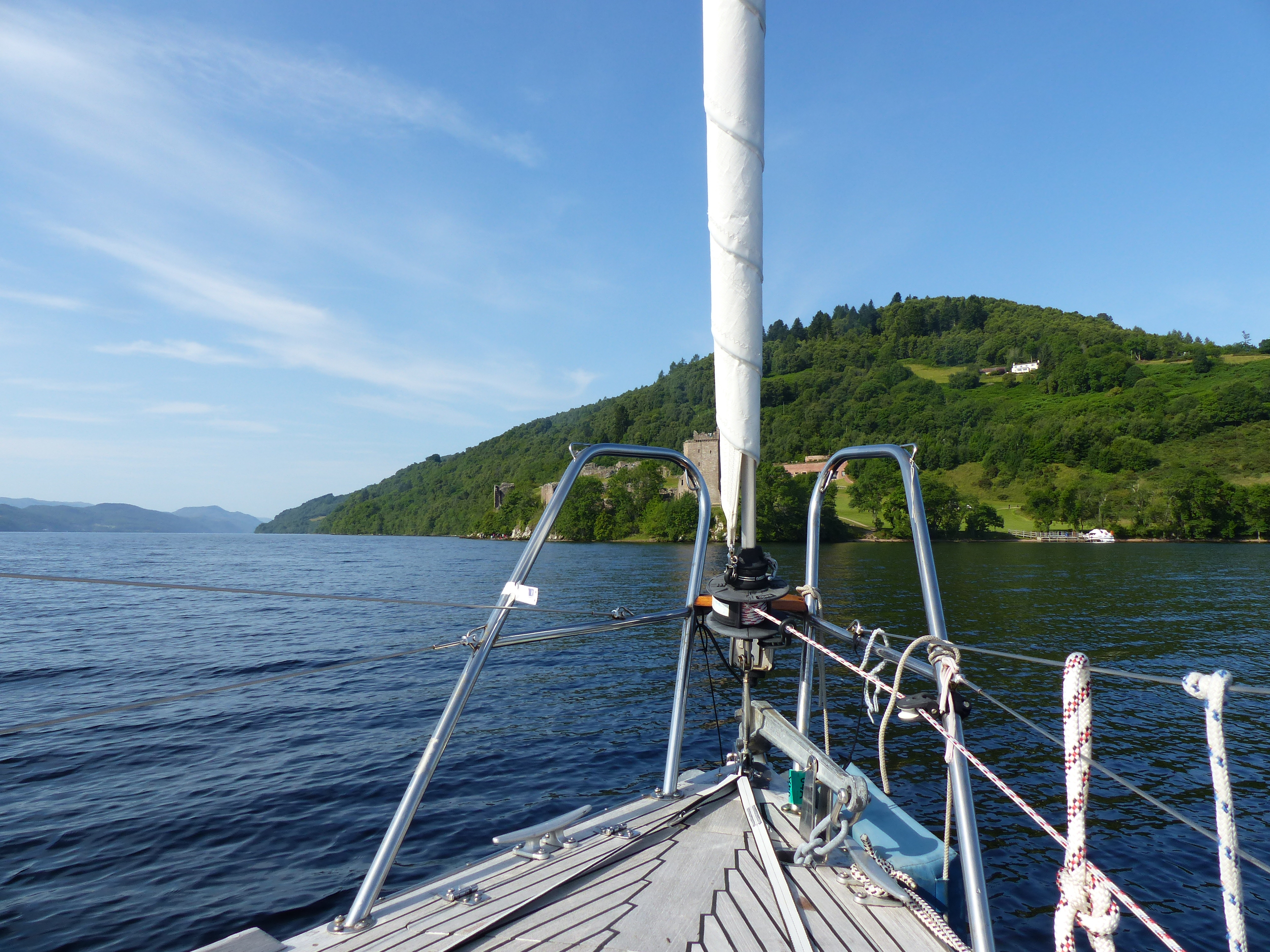 Irgendwann kommt das ehemals mächtige Urquhart Castle in Sicht. Ein mittelalterliches Schloss und DIE Attraktion in Loch Ness. Von Nessie natürlich mal abgesehen. Der Steg direkt davor ist leider für die Ausflugsschiffe reserviert, doch daneben steigt der Grund offenbar steil an. Perfekt um vor Heckanker zu gehen. Dafür gibts dann gleich bewundernde Blicke vom Aufseher, das Konzept hat er nämlich noch nicht gesehen, ist aber völlig einverstanden damit. Die Erkundung des Schlosses kann also losgehen. Und zwar schnell, denn in Invergordon liegen laut seiner Aussage die Disney Magic, Mein Schiff (in unnachahmlicher schottischer Aussprache „MiinSkiff“), und Aida. Wenn die hier aufschlagen wird man das Ganze eher nicht mehr genießen können. Schon Sultan Saladin im 11. Jhd. hatte mit uns Seglern nämlich eins gemeinsam: Die Angst vor aufschlagenden Kreuzfahrern. 😉