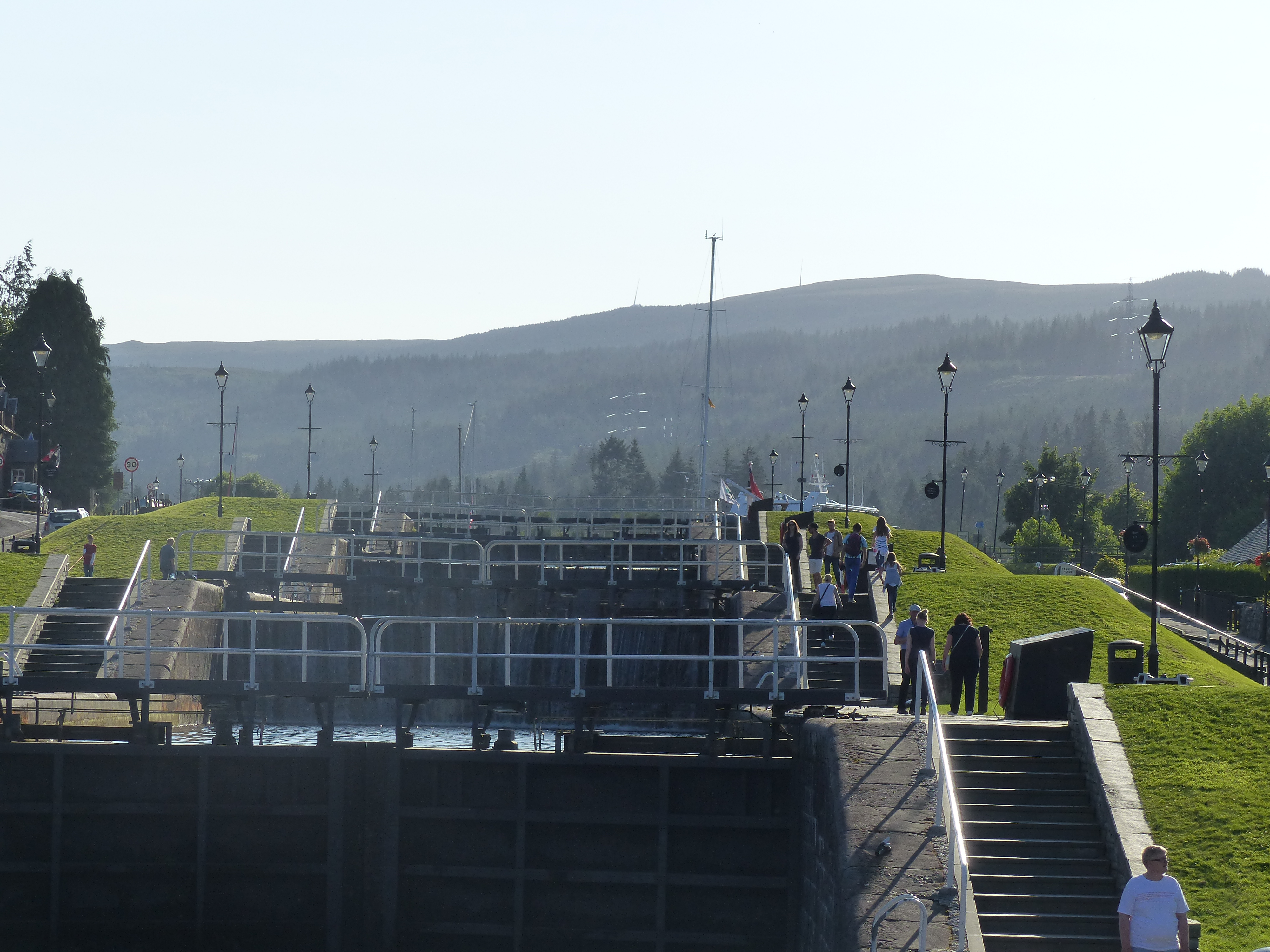 Im fünften Stock angekommen halte ich auch nur für ein kleines Mittagspause am oberen Steg und dann gehts weiter. Noch ohne zu wissen, dass nun das schönste Stück Kanal vor mir liegen würde. Die Landschaft wird lieblicher und bewaldetet. Am linken Ufer scheucht doch tatsächlich ein Golfer eine Schafherde mit wilden Schwüngen seines Schlägers davon. Schottland wie es leibt und lebt. 😉 Die nächste Schleuse, Kytra, ist dann auf einmal so ganz anders als alle anderen bisher. Die Schleusenwärterin ist eine nette ältere Dame, alles ist mit Blüchen bepflanzt und das alte Büro sieht aus wie aus Disneyland. Endlich kam so richtig entspannte Urlaubsstimmung auf, und der schönste Teil des Caledonian Canal sollte vor mir liegen…