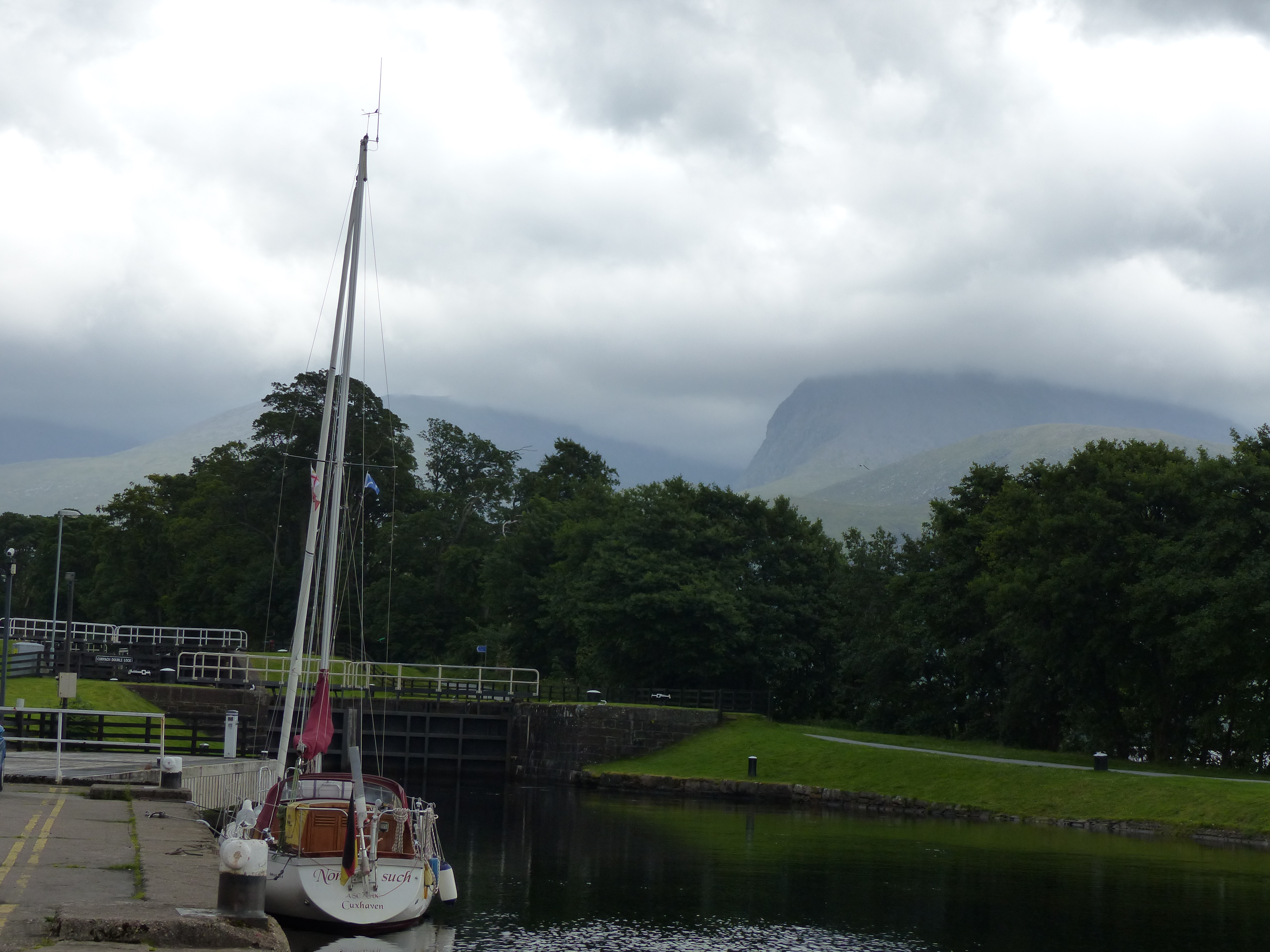 Der letzte Teil des Kanals vergeht schnell und unspektakulär. Selbst die 8er Schleusentreppe „Neptuns Staircase“ rauscht nur so an mir vorbei. Eigentlich sollte der Tag hier schon enden, doch da es sich gerade so ergibt, rutsche ich zusammen mit den Belgiern noch eben schnell durch. Wenige Minuten später bin ich dann auch schon am Ende des Kanals in Corpach angekommen. Die Luft wird wieder salziger.