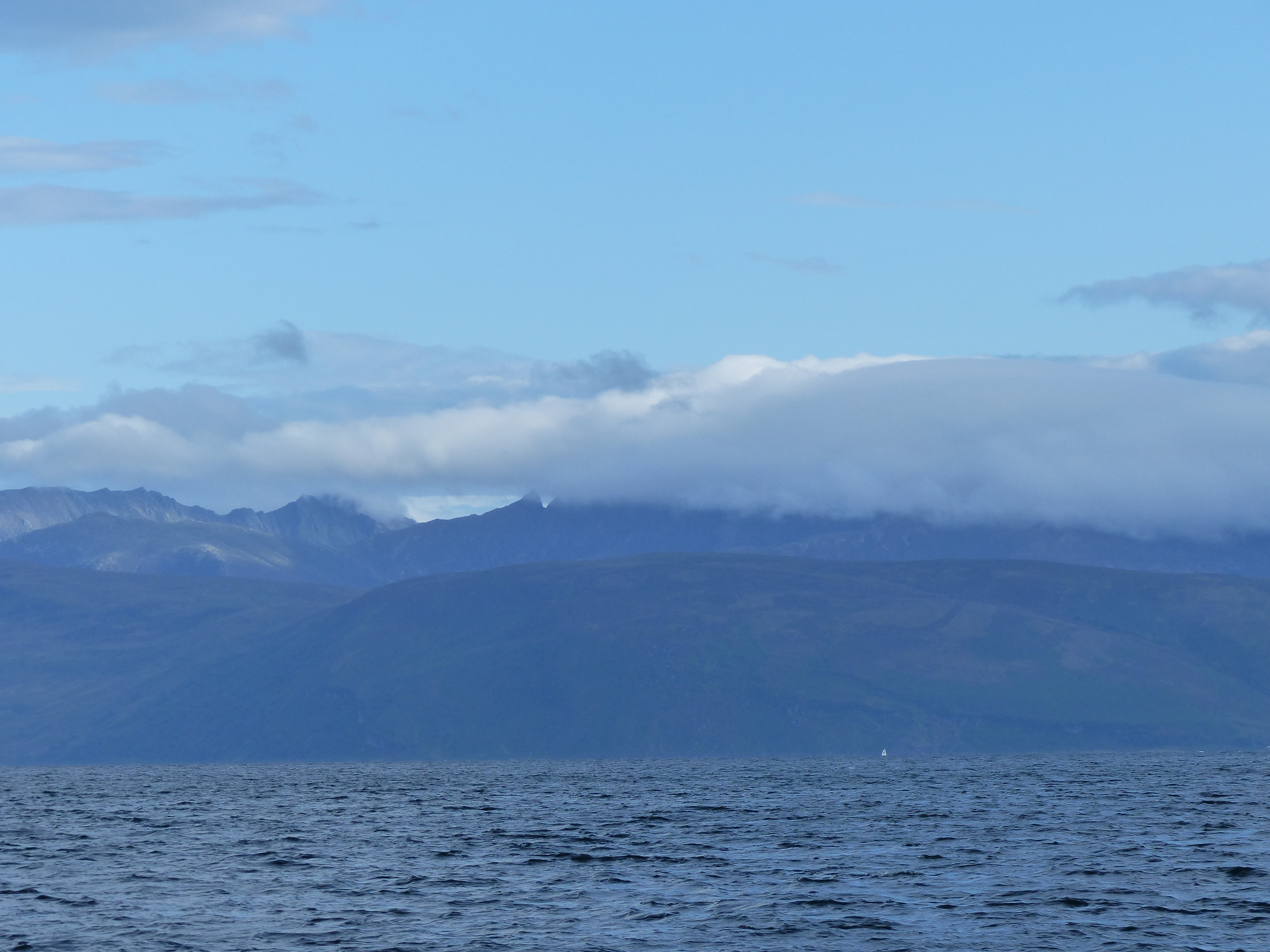 Das Segeln an diesem Nachmittag ist eine echte Wohltat und Entschädigung für gestern. Hier ist man vor dem Atlantikschwell geschützt, die Landscahft ist fast ebenso schön und das Wetter hat sich gebessert. Von den meisten Seglern auf meiner Route wird das Gebiet östlich von Kintyre ausgelassen. Schon jetzt steht für mich fest, dass das ein großer Fehler zu sein scheint. Hier lässt es sich echt aushalten. Da es endlich mal wieder ohne Klippen, Gegenwind und Strom vorwärts geht, segele ich aber wie im Rausch und lasse viele einladend aussehende Ortschaften liegen. An der fast schon mystisch anmutenden Insel Arran geht es in der Dämmerung ebenso vorbei. Es ist bereits stockdunkel, als ich in der kleinen Stadt Campbeltown am Südende von Kintyre, etwa 35 SM südlich von Ardrishaig, anlege. Wieder mal freut mich die freundliche Begrüßung der Fischkutter in der Fahrrinne, die sich nicht über die Anwesenheit des kleinen nervendenen Segelbootes beschweren, sondern fröhlich winken und mir mit „pleasant stay“ einen schönen Aufenthalt in ihrem Ort wünschen.