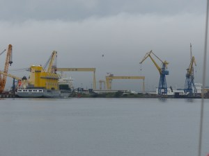 Die Nacht war entspannend und fast ereignislos. Der Wind war ruhig, es gab sehr wenig Schiffsverkehr und dank der Nipptide hielten sich auch die Strömungen hier in Grenzen. Ich konnte sogar einige kurze Schlafhäppchen einlegen. Als die Sonne aufging, lag das Belfast Lough, die große Förde vor der Stadt, schon direkt vor mir. Und ich dachte für kurze Zeit ich wäre im falschen Film aufgewacht: hier sah es fast aus wie in der Kieler Förde. Der langgezogene Meeresarm mit einigen kleinen Vororten, am Ende die Großstadt und große Werftkräne, die das Stadtbild prägen. Nur dass die großen gelben Ungetüme hier nicht zur Howaldtswerft sondern zu Harland & Wolff gehören. Der Bauwerft der Titanic…