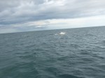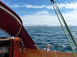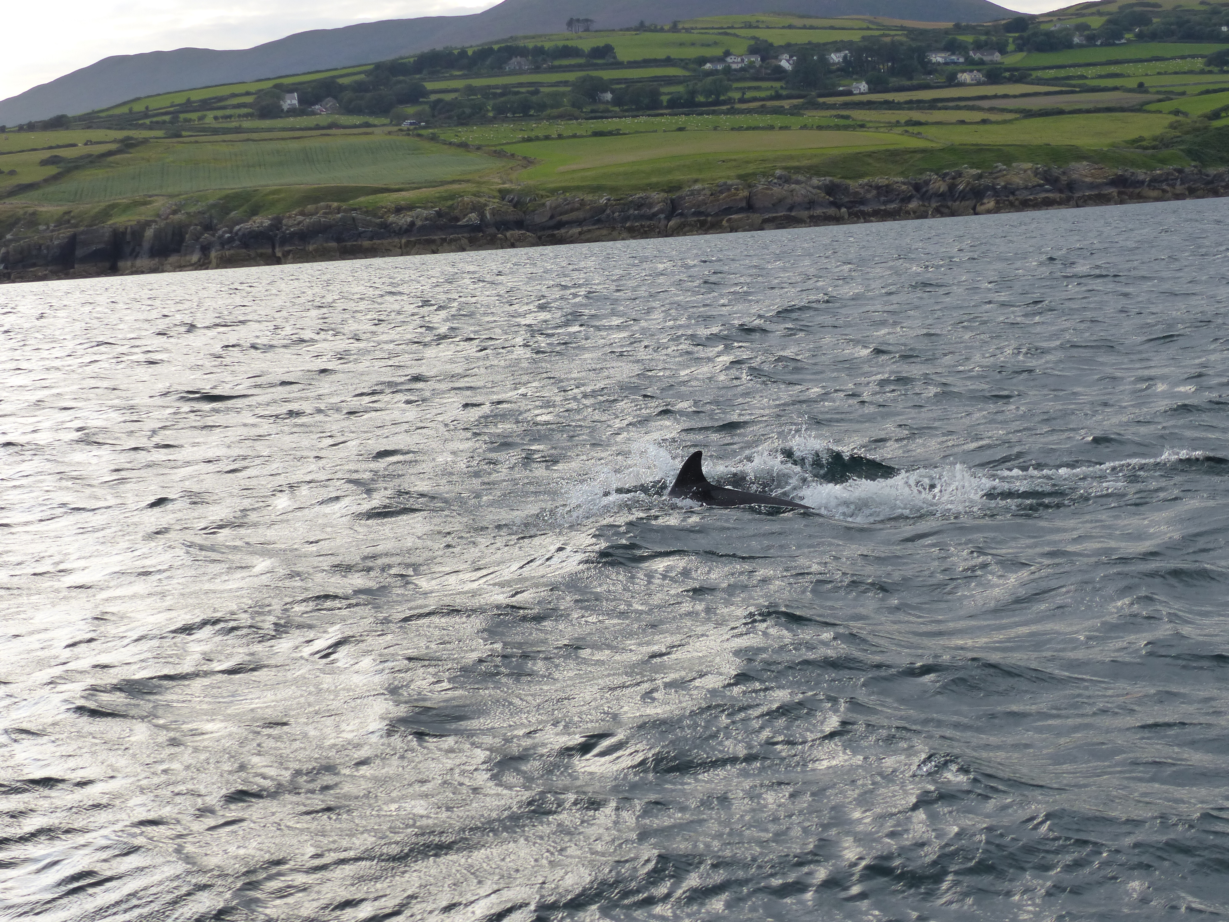 Weit an Backbord gibt es auf einmal eine Wasserfontäne. Schnell greife ich das Fernglas und erblicke tatsächlich… einen Minkwal! Leider bleibt er nicht lange und so wende ich meinen Blick wieder nach Steuerbord und genieße die immer felsiger werdende Landschaft. Eigentlich komisch, würde man die schroffere Küste doch auf der Luvseite, hier der Westseite, erwarten. Dinge über die man sich beim Segeln Gedanken macht… Aus solchen merkwürdigen Gedanken werde ich aber schnell wieder heraus gerissen. Hinter mir spritzt das Wasser wieder auf. Dieses Mal ist es aber kein Wal, sondern schon wieder eine Schule Delphine! In einer langgezogenen Kurve nähern sie sich tierisch schnell von achtern. Fast wie ein Geschwader Kampfjets. Sie schießen in wenigen Zentimetern Abstand am Boot vorbei, springen hoch und tauchen wieder unter der Bugspitze durch. Zumindest von den Bewegungen her ist der Kampfjetvergleich gar nicht mal so daneben gegriffen… Vor der Kullisse mit Felsen, Feldern, Knicks und britischen Herrenhäusern ist das ganze noch mal schöner als neulich in der Irischen See.