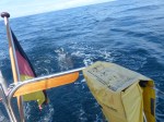 Neu für mich ist allerdings, dass ich in der Mittagsflaute gleich mehrmals von Haien umkreist werde. Für Delfine bewegen sich die Flossen zu langsam und bedächtig,für Wale sind die Viecher zu klein. Irgendwie ein merkwürdiges Gefühl hier draußen ohne eine andere Menschenseele um mich herum von Haien belauert zu wissen. Ne Bifi ins Wasser zu werfen lass ich dann auch lieber sein…