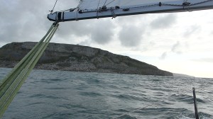 Erster Prüfstein des Tages ist das Kap St. Albans Head. Ich versuche mich das erste Mal an einer Inshore Passage. Die Overfalls, die die Ströme rund um das Kap produzieren, reichen oft mehrere Meilen weit raus. Wegen der knappen Zeit würde ich solche Umwege heute gerne vermeiden. Bei moderaten Bedingungen gibt es nämlich noch eine zweite Möglichkeit: Ganz dicht unter Land, also nur so etwa 100m unter dem Kap, finden sich meist auch keine Overfalls. Und so gucke ich pausenlos auf die 150m hohen Klippen die nur wenige Meter von Nonsuch entfernt in den Himmel ragen während es mit über 10kn über Grund vorwärts geht. Ein Erlebnis der besonderen Art. Als ich im Kopf noch denke wie aufregend das war, blicke ich nach Steuerbord und sehe die tobenden Overfalls in nur wenigen hundert Metern Entfernung. Es ist wirklich irre was hier selbst bei guten Bedinungen abgeht. Die Ströme sind gar nicht viel schneller als in der Elbe oder so, aber die Bedingungen, die sie verursachen sind echt irre.