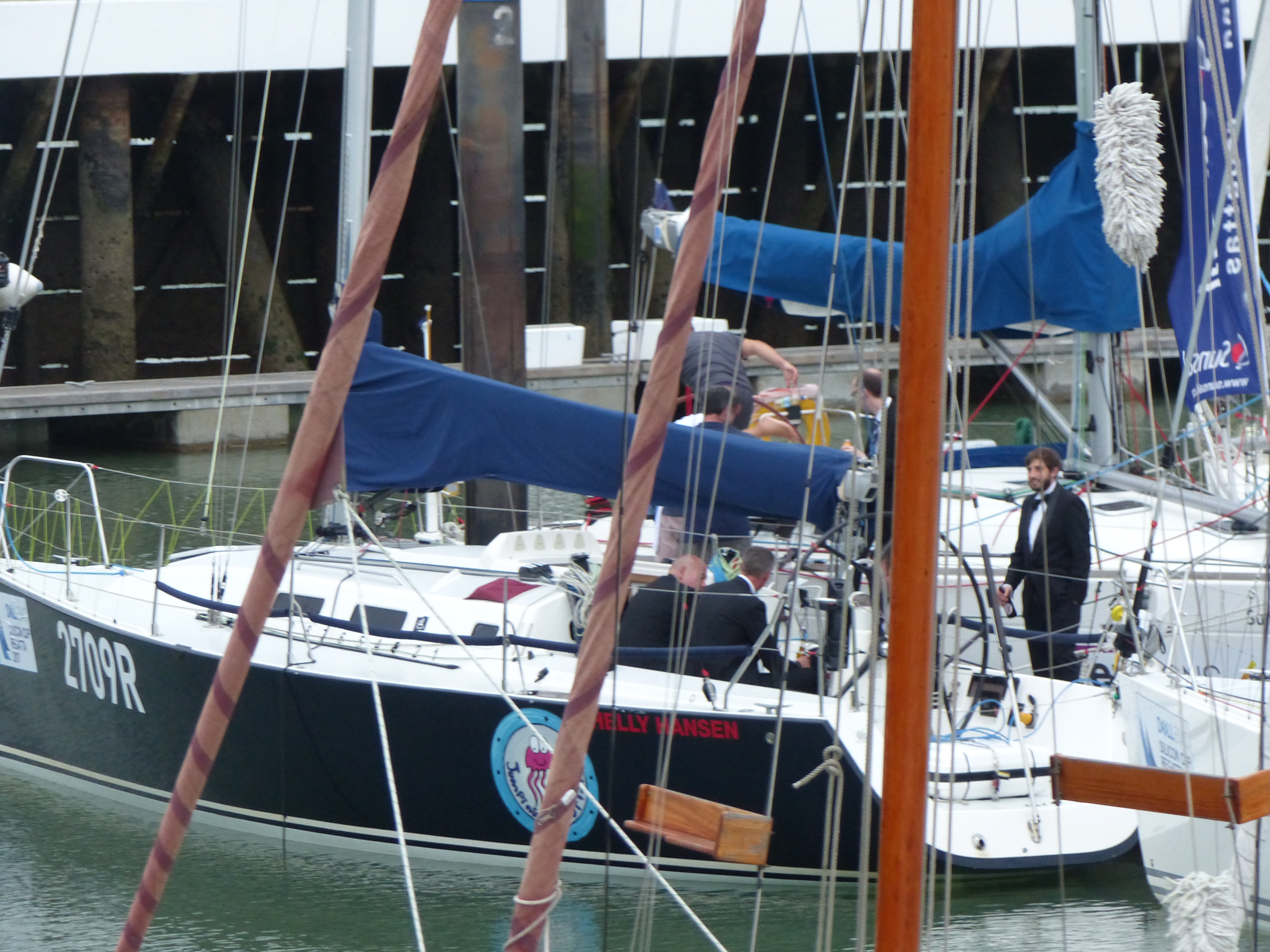 Nachdem ich Papa am nächsten Tag zur Fähre gebracht habe und zum Hafen zurück schlendere, entdecke ich dann noch eine Sache die du so nur in Cowes zu sehen bekommst: Schon seit gestern fand eine Regatta in Cowes statt. Nachmittags lief die Flotte von Einheitsklassenbooten wieder ein. Segel wurden über den Steg geschleppt, es wurde zur Dusche gegangen, Anleger getrunken und gefachsimpelt. Wie Segler eben so sind. Eine Stunde später hatten sich aber alle für die Siegerehrung schick gemacht. Und so saßen die harten Segler, eben noch in Ölhosen und Lederstiefeln, jetzt mit einer Dose Bier in der Hand im Smoking im Cockpit und warteten auf den Rest der Crew. Englischer und gediegener kann eine Regatta wohl nicht ablaufen.